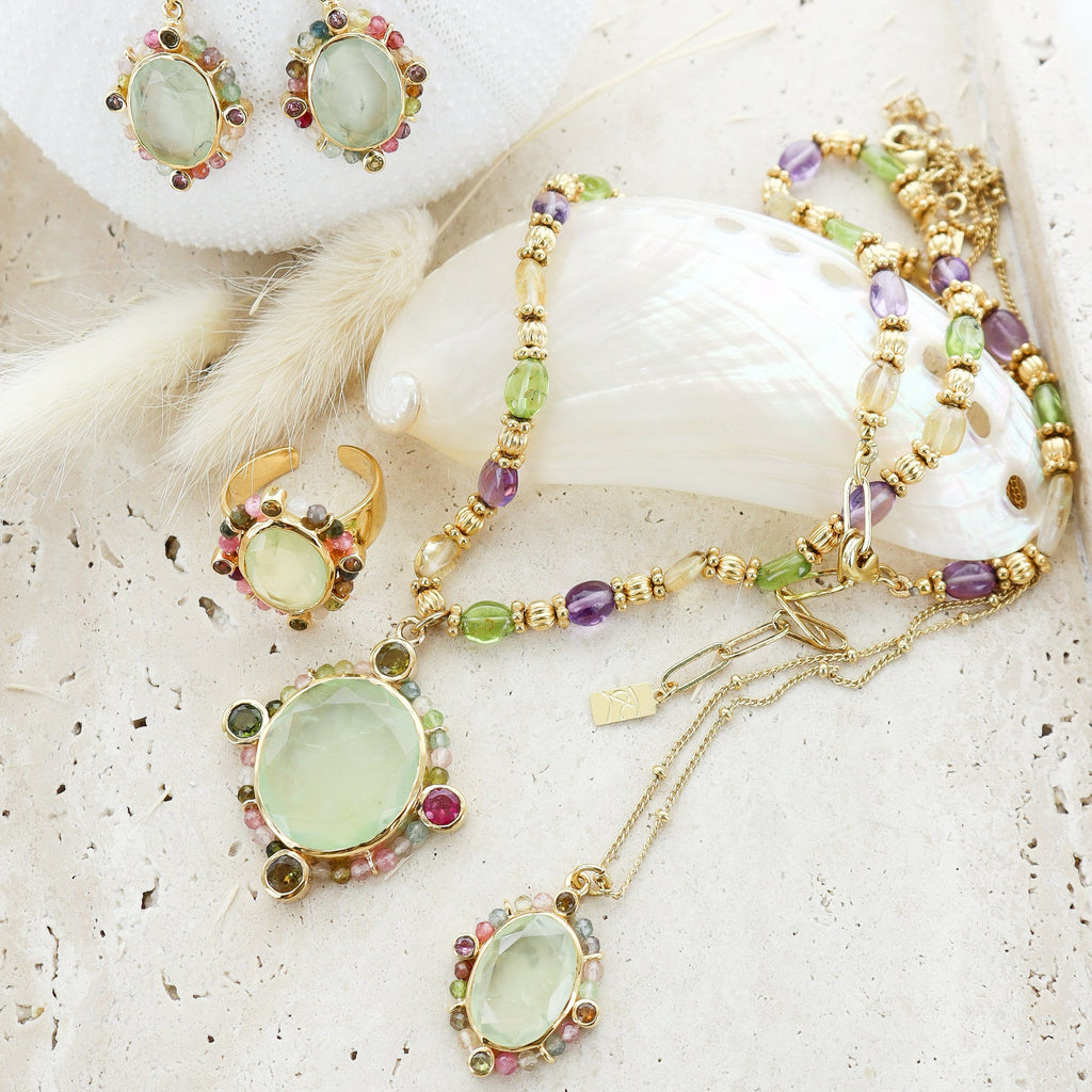 Collier en laiton plaqué or, orné d'une pierre semi-précieuse entourée de petites perles d'eau douce ou de tourmalines.